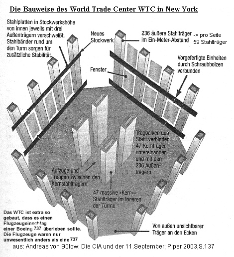 2nd – The Twin Towers could not have been brought down by airplanes. The towers were built so that no plane could bring them down. Light-metal aircraft are physically unable to penetrate such a solidly constructed building. The outer shell of the World Trade Tower buildings consisted on each side every 100 cm of 59 pieces of 36cm x 36cm strong columns of »fire-protected especially solid steel of 6mm – 100mm thickness«, between 30 cm wide, 13 cm thick windows and in the middle of 47 core beams of 90 cm x 36 cm again of 6mm – 100mm thick fireproof steel. »http://www2.ae911truth.org/WTC1_blueprints.php« All airliners are made of aluminum and must be reinforced with frames to prevent them from breaking in the air. Every plane that hits hard surfaces shatters into a thousand pieces. We were shown films that let us assume that two airplanes flew into the two buildings and created a huge hole through exploding kerosene. The videos on which the aircraft appear are extremely short and do not show a clear impact situation; with modern analyses, the same images have been verified as retouched in. On one of these films, even the intact nose tip of the airplane on the other side of the building protrudes after the airplane has flown through the 47 core carrier steel columns without breaking, which is simply physically impossible. The width of the Boeing 767 with a wingspan of 47.6 m does not fit into the empty hole of 36 m at Tower 1, and no part of the aircraft protrudes from it, the hole is empty. The WTC was specially built to withstand the impact of a Boeing 737 aircraft. – Donald Trump (45th President of the USA) said on the same day: https://www.youtube.com/watch?v=vJqcD-fozYw&feature=youtu.be